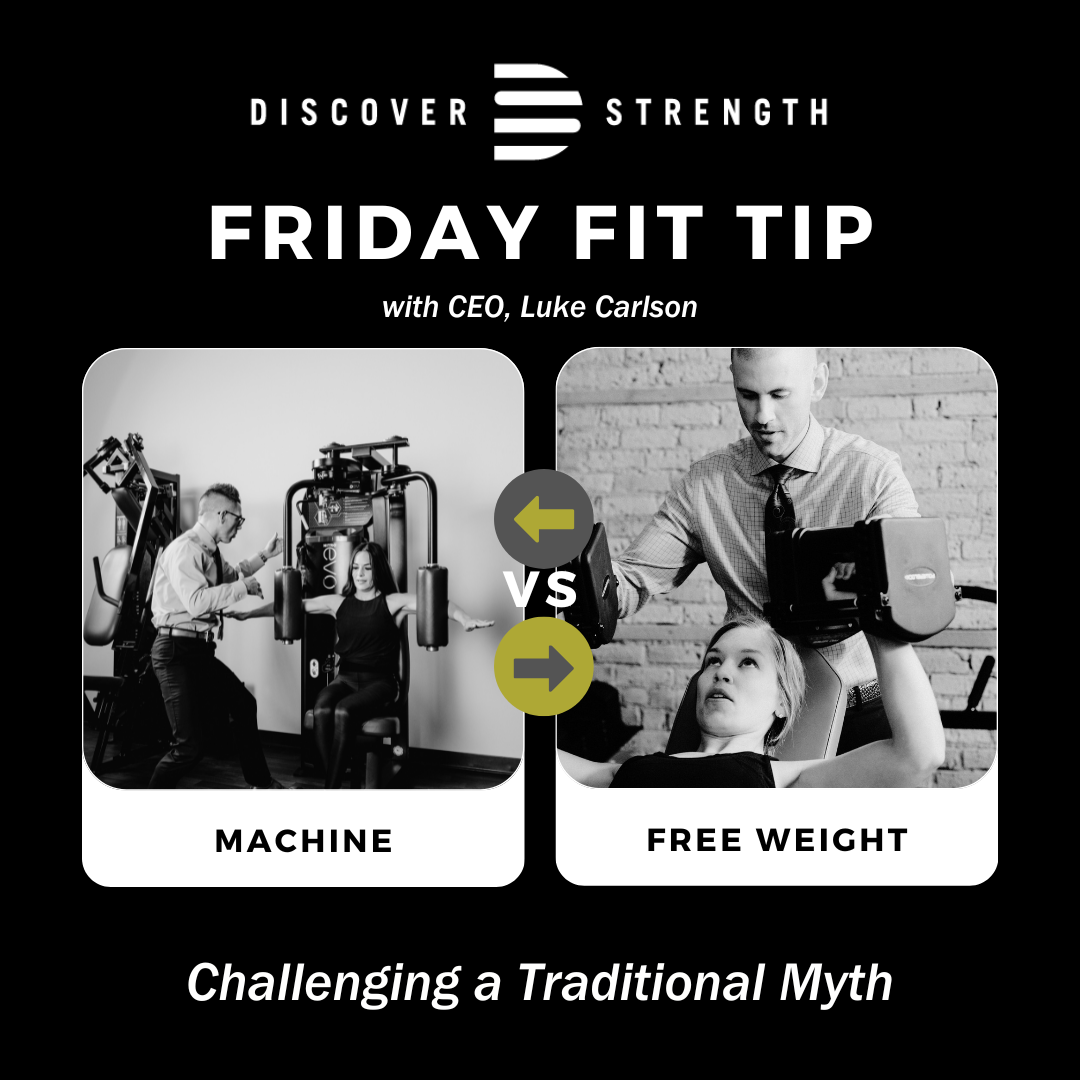This topic represents perhaps the most significant gap between research outcomes and what people are actually doing in their workouts. Talk to a collegiate or professional sports strength and conditioning coach, and they will advise using almost exclusively free weights. Walk into any high school weight room, and you’ll be hard-pressed to find even one machine. In fact, I was recently talking to the CEO of a well-known health club chain on the East Coast, and he was shocked that Discover Strength utilized machines, as his assumption was: Strength training = free weights.